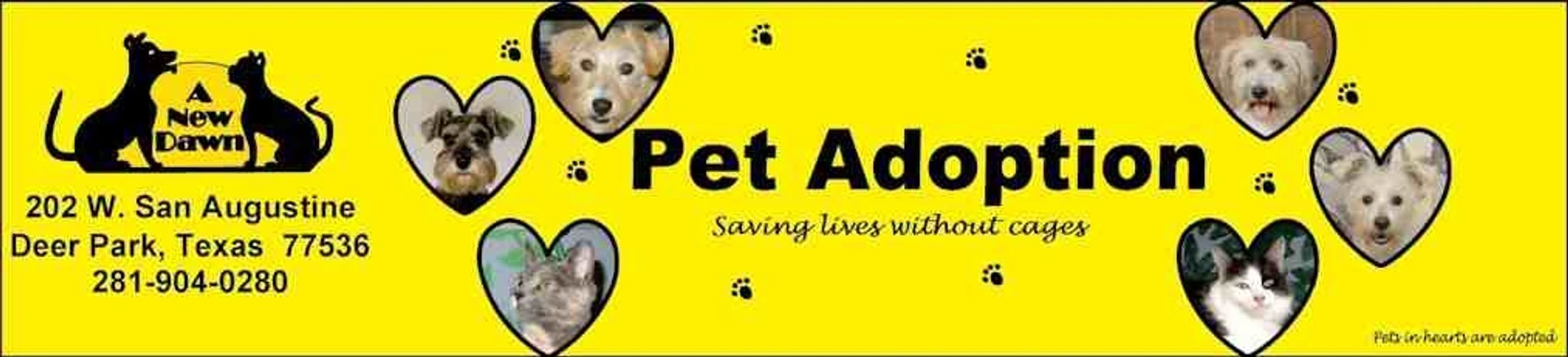 A New Dawn Pet Adoption Center extends heartfelt thanks to the Deer Park community and neighboring regions for their steadfast support through adoptions, donations, and volunteering. We also appreciate Underwood Animal Hospital and VCA Animal Hospital in Pasadena for their dedication to our animals' health, and Dr. Lonsford DVM of Deer Park Animal Hospital for the rental space provided. Our gratitude goes to Raising Cane's for their annual Christmas plush dog campaign, Sycamore Grounds for assistance with advertising, and to God for enabling this small non-profit to do it's calling.